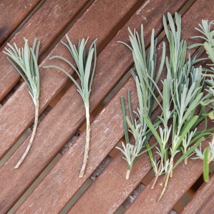 Bekijk jouw lavendelplanten kritisch en kies jonge scheutjes (zachthout) van zo'n 8 centimeter lang. Je herkent deze scheuten aan hun grijsgroene blaadjes en stengels. De stekjes mogen geen bloemen dragen.